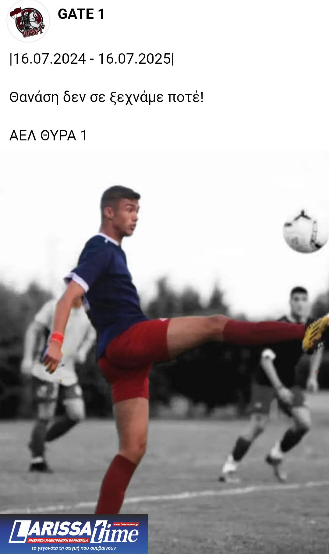 Με αφορμή την συμπλήρωση ενός χρόνου από το θάνατο του ποδοσφαιριστή της ΑΕΛ, Θανάση Τζιότζιου, σε ηλικία μόλις 18 ετών, οι οργανωμένοι οπαδοί των «βυσσινί» Θύρα 1 μέσα από τα social media έκαναν την παρακάτω ανάρτηση.