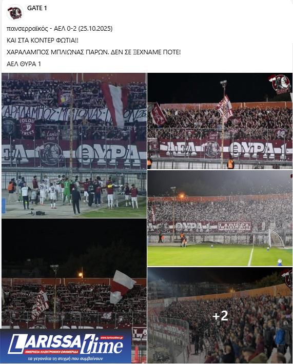 Με αφορμή την εκτός έδρας αναμέτρηση για την Superleague της ΑΕΛ με τον Πανσερραϊκό, που έγινε το Σάββατο (25/10) στο Δημοτικό Γήπεδο Σερρών οι οργανωμένοι οπαδοί των «βυσσινί» Θύρα 1 μέσα από τα social media έκαναν την παρακάτω ανάρτηση μαζί με φωτογραφίες.