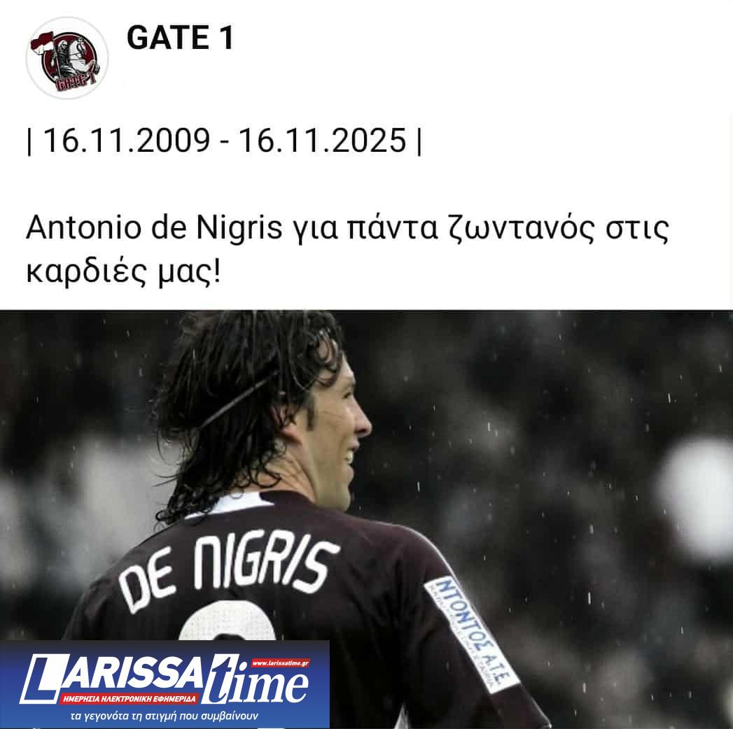 Οι οργανωμένοι οπαδοί των «βυσσινί» Θύρα 1, με αφορμή την συμπλήρωση 16 χρόνων από το θάνατο του Αντόνιο Ντε Νίγκρις, μέσα από τα social media ανέβασαν μία εικόνα και έγραψαν: “Antonio de Nigris για πάντα ζωντανός στις καρδιές μας!”