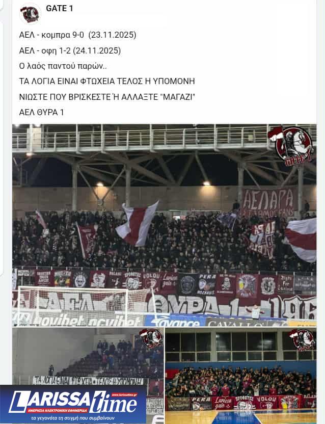 Με αφορμή την εντός έδρας αναμέτρηση για την Superleague της ΑΕΛ με τον ΟΦΗ που έγινε το Σάββατο (24/11) στο AEL FC ARENA και τον εντός έδρας αγώνα της ΑΕΛ Futsal, οι οργανωμένοι οπαδοί των «βυσσινί» Θύρα 1 μέσα από τα social media έκαναν την παρακάτω ανάρτηση μαζί με φωτογραφίες.