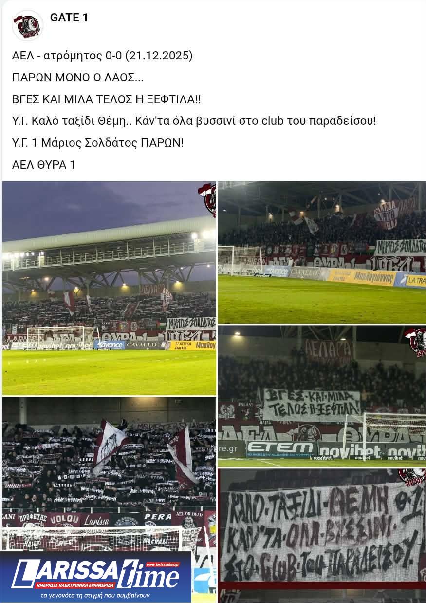 Με αφορμή την εντός έδρας αναμέτρηση για την Superleague της ΑΕΛ με τον Ατρόμητο που έγινε την Κυριακή (21/12) στο AEL FC ARENA οι οργανωμένοι οπαδοί των «βυσσινί» Θύρα 1 μέσα από τα social media έκαναν την παρακάτω ανάρτηση μαζί με φωτογραφίες.