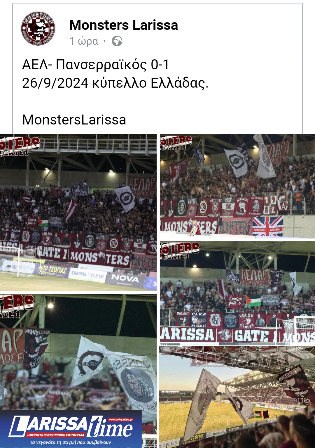 Με αφορμή την εντός έδρας αναμέτρηση του Κυπέλλου Ελλάδας της ΑΕΛ με τον Πανσερραϊκό, που έγινε την Πέμπτη (26/09) στο AEL FC ARENA, οι οργανωμένοι οπαδοί των «βυσσινί» Monsters Larissa, μέσα από τα social media, έκαναν την παρακάτω ανάρτηση μαζί με φωτογραφίες.