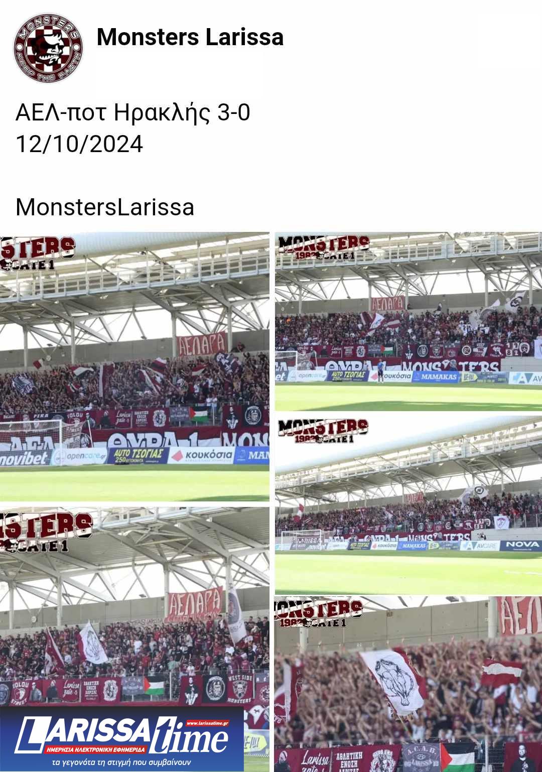 Με αφορμή την εντός έδρας αναμέτρηση της ΑΕΛ απέναντι στον ΠΟΤ Ηρακλή για την Superleague 2 που έγινε το Σάββατο (12/10) στο AEL FC Arena οι οργανωμένοι οπαδοί των «βυσσινί» Monsters μέσα από τα social media έκαναν την παρακάτω ανάρτηση.