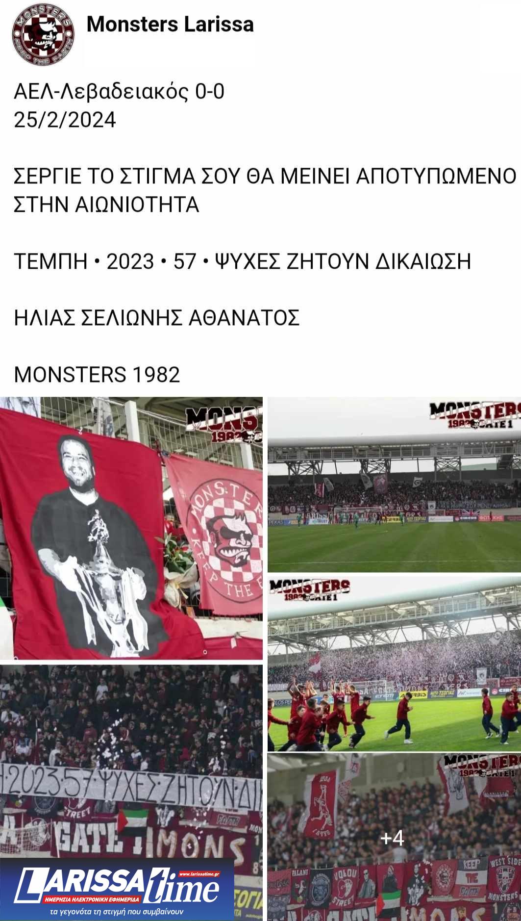 Με αφορμή την αναμέτρηση ΑΕΛ-Λεβαδειακός 0-0 για την Superleague 2 που έγινε στο AEL FC ARENA, οι οργανωμένοι οπαδοί των «βυσσινί» Monsters μέσα από τα social media έκαναν την παρακάτω ανάρτηση, μαζί με φωτογραφίες.