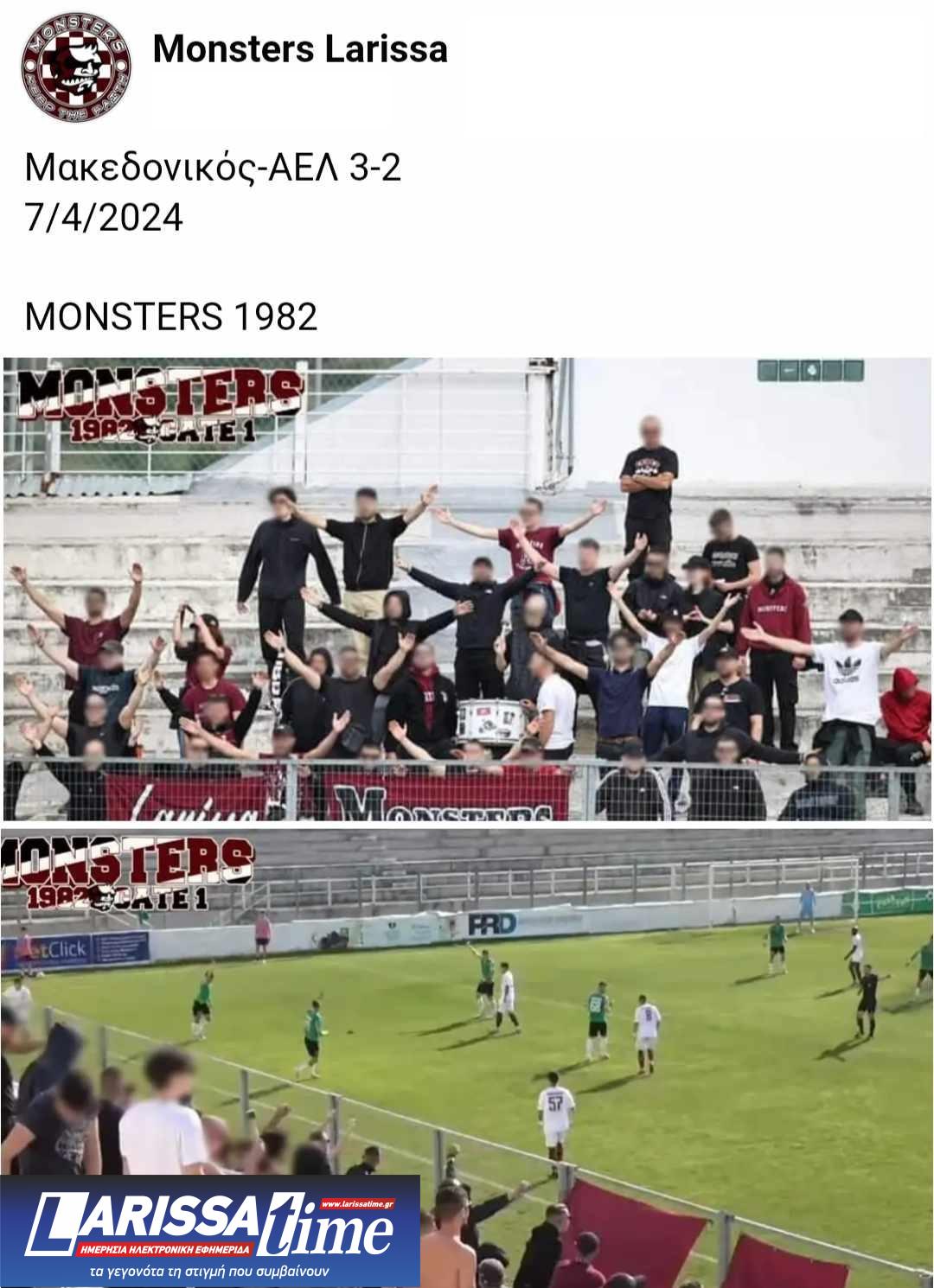 Με αφορμή την αναμέτρηση Μακεδονικός-ΑΕΛ 3-2 για τα Play Off της Superleague 2 που έγινε στο γήπεδο Μακεδονικού, οι οργανωμένοι οπαδοί των «βυσσινί» Monsters μέσα από τα social media έκαναν την παρακάτω ανάρτηση, μαζί με φωτογραφίες.