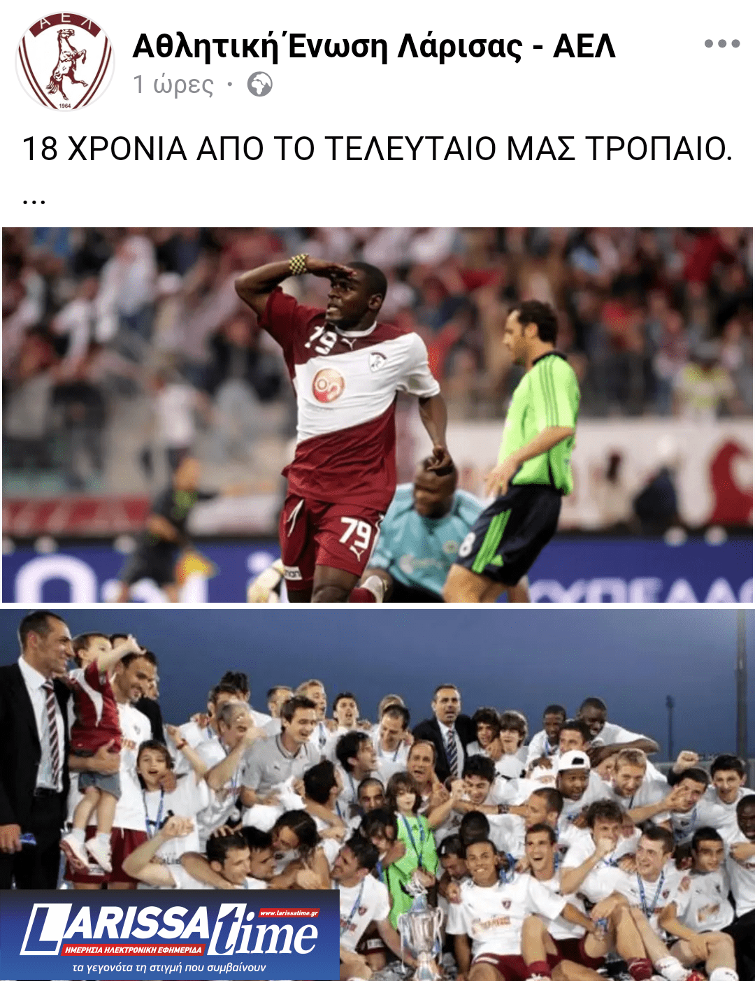 Μέσω της επίσημης σελίδας της στα social media, η Ερασιτεχνική ΑΕΛ με αφορμή τη συμπλήρωση 18 χρόνων από την κατάκτηση του δεύτερου Κυπέλλου Ελλάδας, έκανε την παρακάτω ανάρτηση, ανεβάζοντας και εικόνες από εκείνη τη μεγάλη μέρα.