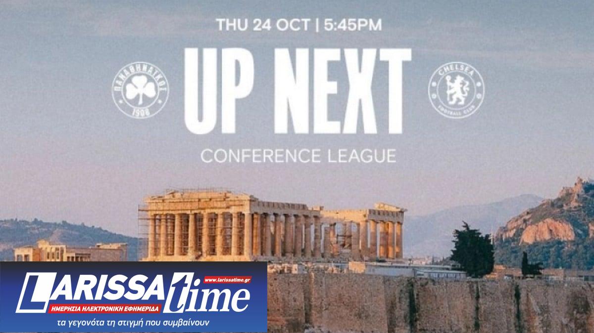 Η φωτογραφία συνοδεύεται από πληροφορίες για τον αγώνα απέναντι στον Παναθηναϊκό, περιλαμβάνοντας την ημερομηνία, την ώρα διεξαγωγής καθώς και την αναφορά στο Conference League, το οποίο φέρνει αντιμέτωπες τις δύο ομάδες.