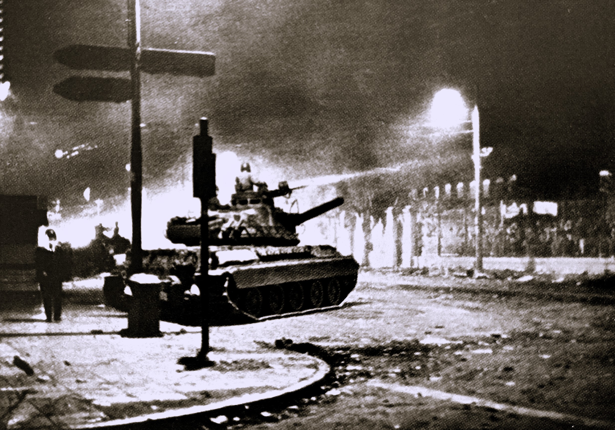 Ο βαρύς ίσκιος των αρμάτων στο φόντο της θολής από τα δακρυγόνα ατμόσφαιρας προκαλεί φόβο.