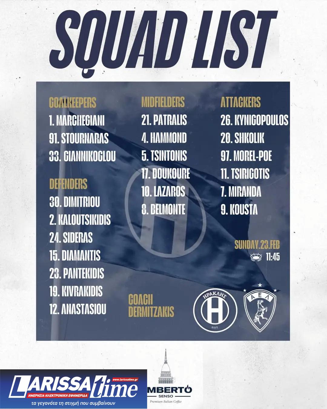 Ολοκληρώθηκε η προετοιμασία του ΠΟΤ Ηρακλή για το εντός έδρας παιχνίδι με την ΑΕΛ, το οποίο θα διεξαχθεί την Κυριακή (23/02) με ώρα έναρξης στις 11:45 στο Καυτανζόγλειο Στάδιο, για την 1η αγωνιστική των Play off του 1ου ομίλου της Super League 2. Ο Παύλος Δερμιτζάκης ανακοινωσε τους παίκτες που απαρτίζουν την αποστολή του ΠΟΤ Ηρακλή για το παιχνίδι με την ΑΕΛ, που αποτελείται από τους εξής 22 ποδοσφαιριστές:
