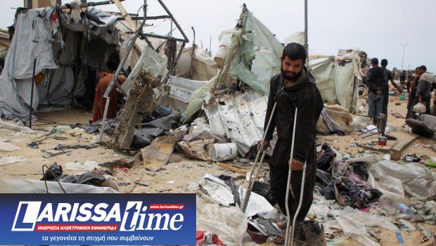 Παλαιστίνιοι επιθεωρούν έναν καταυλισμό σκηνών που καταστράφηκε από ισραηλινό χτύπημα κατά τη διάρκεια ισραηλινής στρατιωτικής επιχείρησης, στη Ράφα (Πηγή: REUTERS/Hatem Khaled)