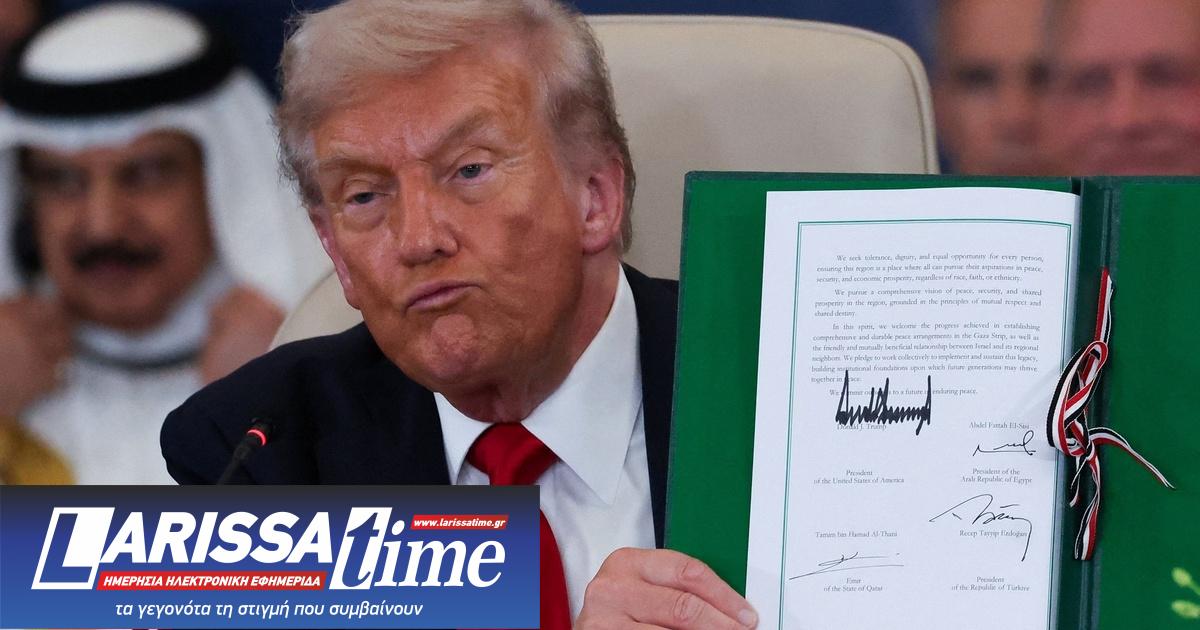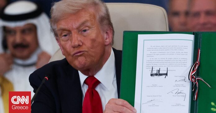 Στη Σύνοδο για τη Γάζα στο Σαρμ ελ Σέιχ της Αιγύπτου, ο Τραμπ υπέγραψε, μαζί με τους ηγέτες της Αιγύπτου, του Κατάρ και της Τουρκίας, τη διακήρυξη «Ειρήνη 2025», με στόχο την παγίωση της κατάπαυσης του πυρός και την έναρξη μιας νέας περιόδου σταθερότητας στη Γάζα.