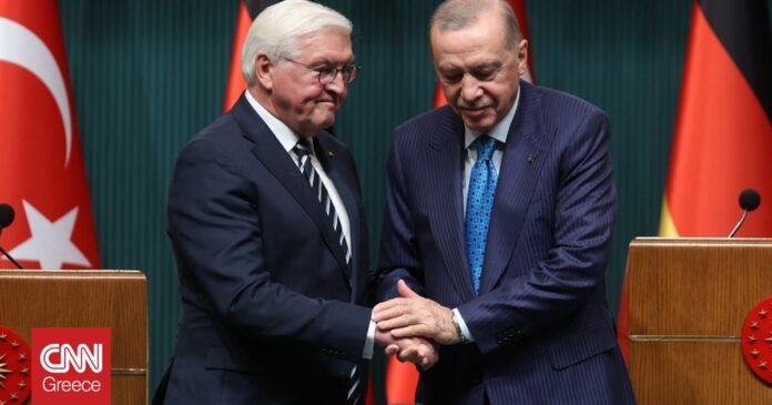 Από την πλευρά του, ο Γερμανός πρόεδρος Φρανκ-Βάλτερ Σταϊνμάιερ έκανε λόγο για ειλικρινή συζήτηση με τον Τούρκο πρόεδρο και παραδέχτηκε ότι υπάρχει διαφορετική προσέγγιση σε σειρά θεμάτων μεταξύ της χώρας του και της Τουρκίας, ωστόσο υπογράμμισε ότι υπάρχει κοινή βούληση για διαρκή ειρήνη.