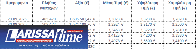 Η «Eurobank Ergasias Υπηρεσιών και Συμμετοχών Ανώνυμη Εταιρεία» («Eurobank Holdings»), σε συνέχεια της από 07.05.2025 ανακοίνωσής της σχετικά με την έναρξη εφαρμογής του Προγράμματος Επαναγοράς Ιδίων Μετοχών («Πρόγραμμα»), που εγκρίθηκε με την απόφαση της Τακτικής Γενικής Συνέλευσης των Μετόχων της Eurobank Holdings στις 30.04.2025 και σε συνέχεια της από 30.04.2025 απόφασης του Διοικητικού Συμβουλίου της, ενημερώνει το κοινό ότι κατά το διάστημα 29/09/2025 – 03/10/2025 απέκτησε συνολικά, στο πλαίσιο του Προγράμματος, 2.211.588 μετοχές εκδόσεως της ιδίας («Ίδιες Μετοχές») που διαπραγματεύονται στο Χρηματιστήριο Αθηνών («Χ.Α.»), με μέση τιμή κτήσης €3,3624, ανά μετοχή και συνολικό κόστος €7.436.170,32