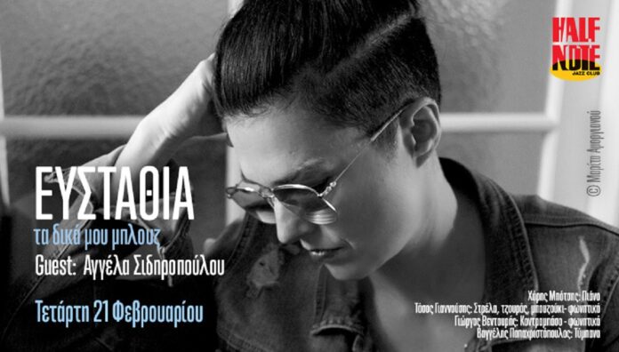Η Ευσταθία τραγουδά «Τα δικά μου μπλουζ», μια μουσική παράσταση που κάνει φανερή τη διάθεση της τραγουδοποιού για πειραματισμούς και μιας αυτοαναιρούμενης αποδόμησης που κλείνει παιχνιδιάρικα το μάτι στην σοβαροφάνεια των καιρών μας, την Τετάρτη 21 Φεβρουαρίου στο Half Note Jazz Club.