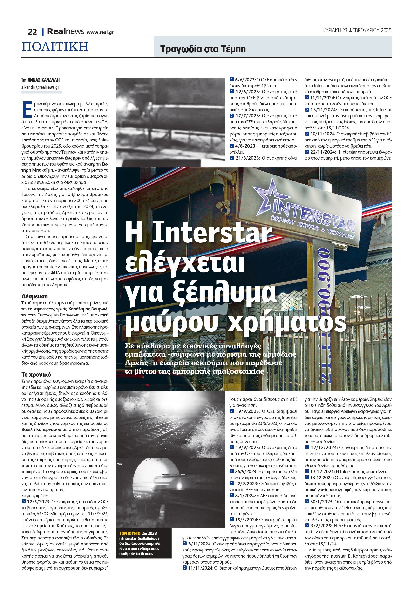 Σε κύκλωμα με εικονικές συναλλαγές εμπλέκεται -σύμφωνα με πόρισμα της αρμόδιας Αρχής- η εταιρεία σεκιούριτι που παρέδωσε τα βίντεο της εμπορικής αμαξοστοιχίας. Εμπλεκόμενη σε κύκλωμα με 57 εταιρείες, οι οποίες φέρονται ότι εξαπατούσαν το Δημόσιο προκαλώντας ζημία που αγγίζει τα 15 εκατ. ευρώ μόνο από απώλεια ΦΠΑ, είναι η Interstar.
