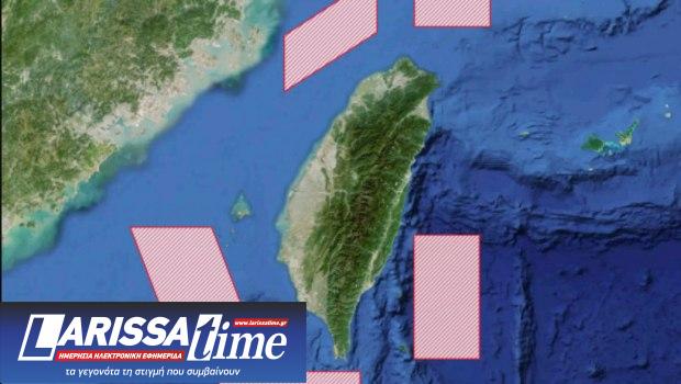 Η Κίνα ανήγγειλε σήμερα Δευτέρα «μεγάλα» στρατιωτικά γυμνάσια γύρω από την Ταϊβάν, με χρήση πραγματικών πυρών, που αναμένεται να διεξαχθούν από αύριο Τρίτη σε πέντε περιοχές σε ύδατα και στον εναέριο χώρο περί τη νήσο (στην εικόνα από το Χ, @XHNews, επάνω, οι περιοχές όπου θα πραγματοποιηθούν τα γυμνάσια).