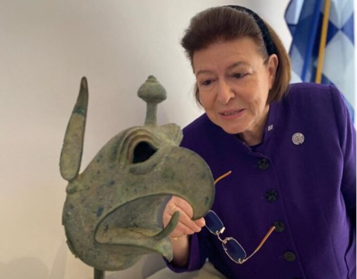 Η χάλκινη κεφαλή του γρύπα, η οποία κοσμούσε χάλκινο τριποδικό λέβητα και χρονολογείται στα 650-625 π.Χ., αποτελεί ένα εξαίρετο δείγμα της αρχαίας ελληνικής μεταλλοτεχνίας επιστρέφει στην Ελλάδα κατόπιν μακράς και συστηματικής συνεργασίας του Υπουργείου Πολιτισμού και του Μουσείου.