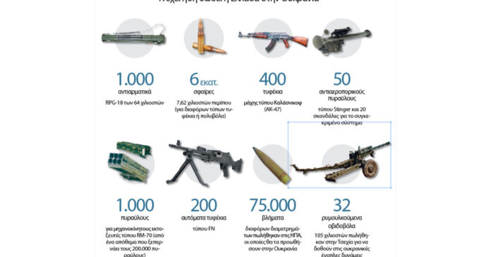 Συνολικά, η Αθήνα έχει παραχωρήσει έως τώρα στην Ουκρανία πολυβόλα, αντιαρματικούς πυραύλους, σφαίρες, οβίδες και οβιδοβόλα, είτε ως δωρεά είτε πουλώντας σε άλλα κράτη, τα οποία με τη σειρά τους τα παραχωρούν στο Κίεβο.