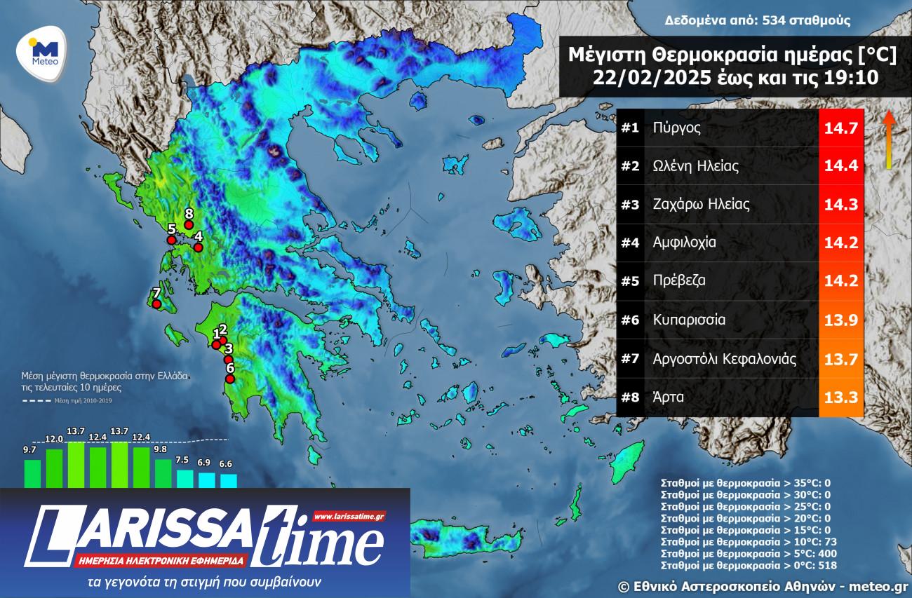 Στον χάρτη του Meteo παρουσιάζονται οι μέγιστες θερμοκρασίες όπως καταγράφηκαν από το δίκτυο αυτόματων μετεωρολογικών σταθμών του Εθνικού Αστεροσκοπείου Αθηνών, ενώ αναγράφονται και οι οκτώ υψηλότερες μέγιστες θερμοκρασίες κατά τις μεσημεριανές ώρες του Σαββάτου 22/02.