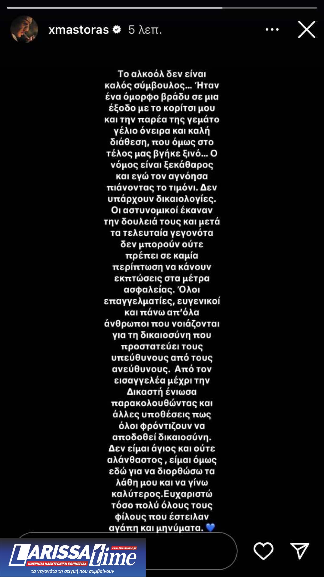 Στο Instagram Story που δημοσίευσε, ο Χρήστος Μάστορας παραδέχτηκε ότι το αλκοόλ «δεν είναι καλός σύμβουλος», τονίζοντας ότι οι αστυνομικοί έκαναν τη δουλειά τους.