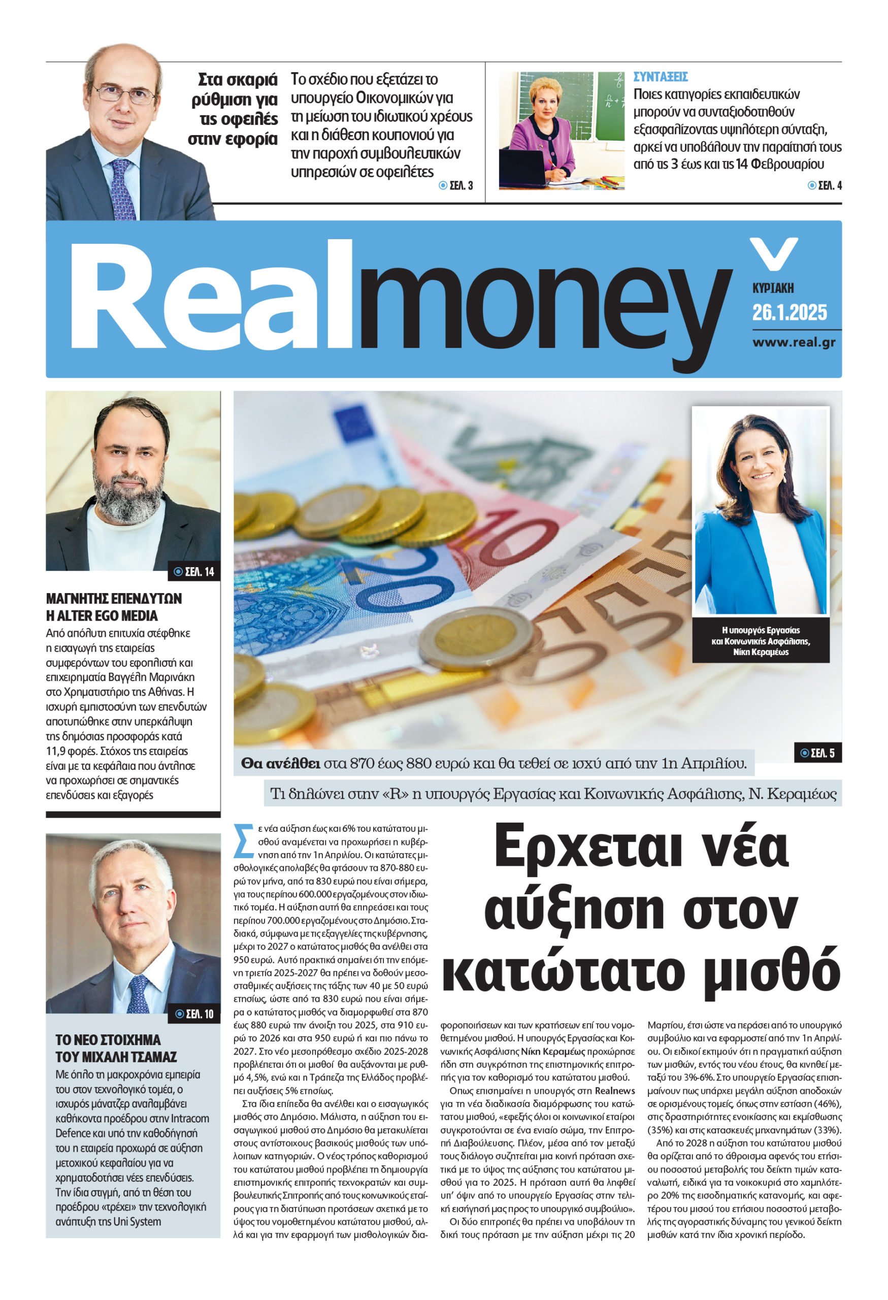 – Έρχεται νέα αύξηση στον κατώτατο μισθό. Θα ανέλθει στα 870 έως 880 ευρώ από τα 830 που είναι σήμερα και αναμένεται να τεθεί σε ισχύ από την 1η Απριλίου. Πώς θα διαμορφωθούν οι νέες αποδοχές για 600.000 εργαζομένους στον ιδιωτικό τομέα και για 700.000 δημοσίους υπαλλήλους. Τι δηλώνει στην «R» η υπουργός Εργασίας και Κοινωνικής Ασφάλισης, Νίκη Κεραμέως.