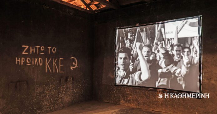 Επιστρέφοντας στα οργανωτικά της έκθεσης, ο Τάσος Αντωνίου μού λέει ότι η πρώτη σημαντική απόφαση για τους οργανωτές ήταν η επιλογή του κτιρίου με τη «γυμνή» του επιδερμίδα, με το εμφανές μπετόν, τα τούβλα και τις αδρές, σκληρές επιφάνειες που παίζουν πρωταγωνιστικό ρόλο στη δημιουργία της υποβλητικής ατμόσφαιρας. «Την έκθεση διατρέχει μια σκηνοθετική προσέγγιση που φιλοδοξεί να μεταδώσει τα μηνύματα του ΚΚΕ σε ευρύτερα κοινά», συνοψίζει. Οταν τον ρωτάω γι’ αυτά τα διαρκή συναισθηματικά περάσματα από την έξαψη στο πένθος, καταλαβαίνω ότι η λέξη «πένθος» δεν του αρέσει. «Ναι, πολλοί φεύγουν από την έκθεση δακρυσμένοι. Ομως, δεν είναι στόχος της έκθεσής μας απλά να συγκινήσουμε, να μιλήσουμε για κάποιους “αγωνιστές που θυσιάστηκαν για την πατρίδα”. Δημιουργήσαμε μια ιστορική – πολιτική έκθεση με ντοκουμέντα και σύγχρονα συμπεράσματα και εκεί θα θέλαμε να σταθεί ο επισκέπτης. Δεν θέλαμε να κάνουμε ένα μνημόσυνο, στεκόμαστε σε αυτή τη δεκαετία –που εμείς οι κομμουνιστές την έχουμε μέσα στην καρδιά μας– για να στοχαστούμε πάνω στα κρίσιμα γεγονότα της, να πάρουμε δύναμη και διδάγματα για το μέλλον».