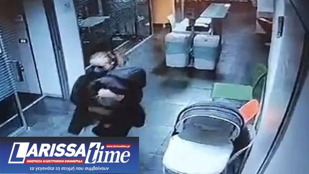 Κάμερα ασφαλείας κατέγραψε τη στιγμή που έχει στην αγκαλιά της το νεογνό και με τη βοήθεια του συνεργού της, το βάζουν στο καρότσι και εξαφανίζονται.