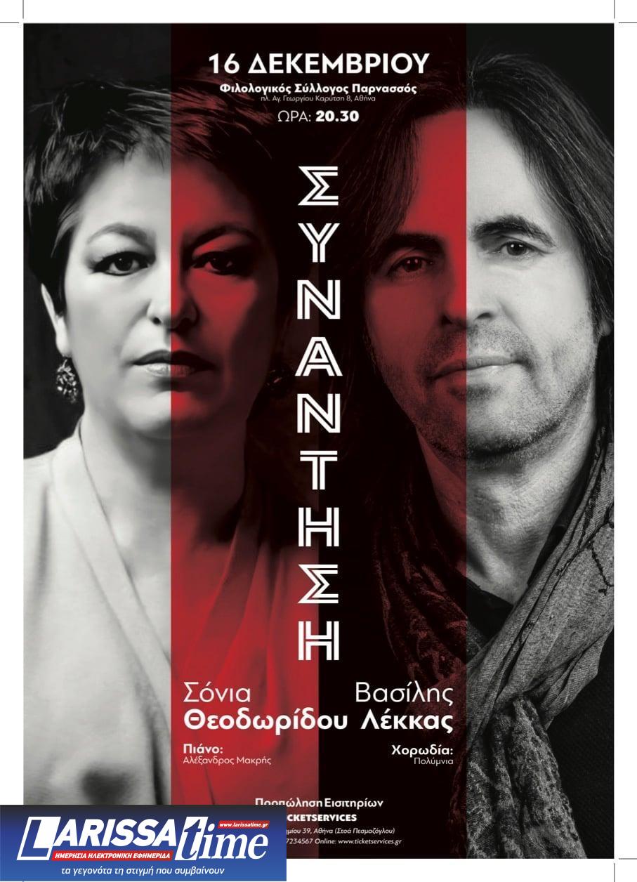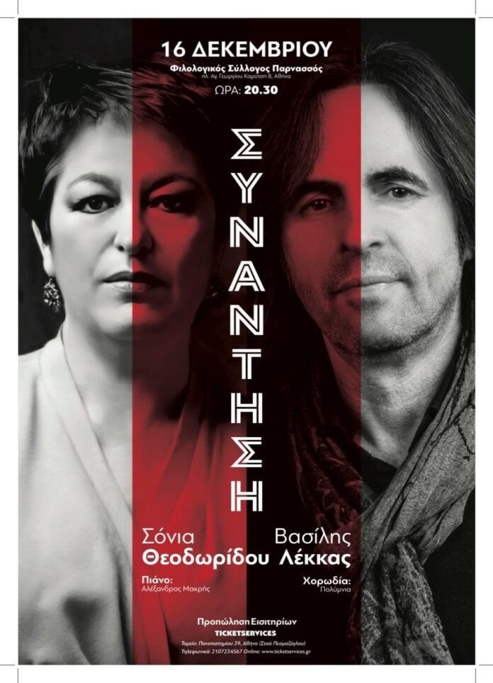 Μια απρόσμενη “συνάντηση”, ένα ρεσιτάλ με την συμμετοχή της διεθνούς φήμης σοπράνο Σόνιας Θεοδωρίδου και του καταξιωμένου ερμηνευτή Βασίλη Λέκκα θα παρουσιαστεί τη Δευτέρα 16 Δεκεμβρίου και ώρα 20:30 στο Φιλολογικό Σύλλογο Παρνασσός.