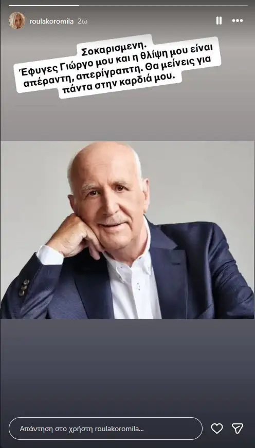 Θλίψη σκόρπισε η είδηση του θανάτου του Γιώργου Παπαδάκη. Η Ρούλα Κορομηλά σε ανάρτησή της στα social media δήλωσε σοκαρισμένη και θλιμμένη.