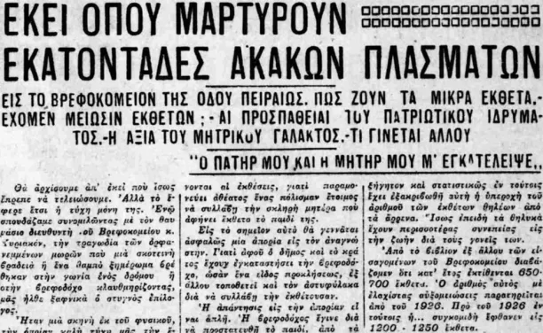 Σύμφωνα με δημοσιεύματα της εποχής, στις αρχές της δεκαετίας του 1950 κάθε χρόνο μόνο στο Δημοτικό Βρεφοκομείο Αθηνών, που τότε βρισκόταν στην οδό Πειραιώς, εγκαταλείπονταν περίπου 650 με 700 βρέφη!
