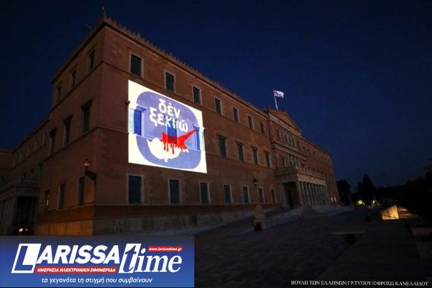 Με το εμβληματικό σήμα «Δεν ξεχνώ» για την εισβολή του «Αττίλα» στην Κύπρο, το 1974, φωταγωγήθηκε η Βουλή των Ελλήνων, καθώς φέτος συμπληρώνονται 50 χρόνια από την παράνομη τουρκική στρατιωτική εισβολή στη Μεγαλόνησο.