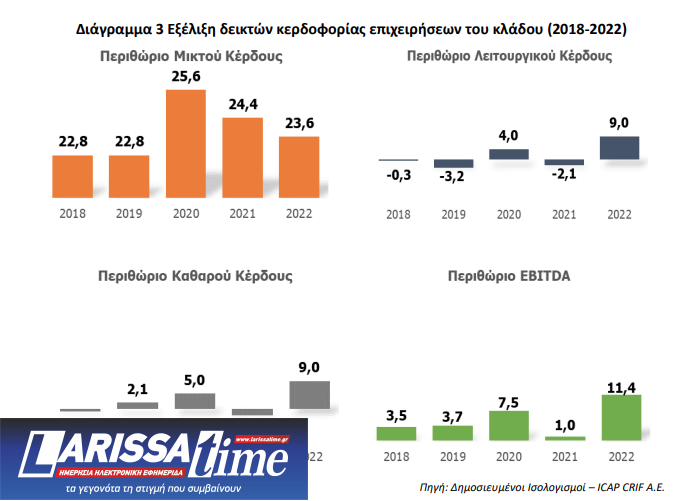 Οι συνολικές πωλήσεις των 18 επιχειρήσεων αυξήθηκαν κατά 17,6% το 2022 έναντι του 2021. Ομοίως, τα μικτά κέρδη αυξήθηκαν κατά 17% την ίδια περίοδο. Τα λειτουργικά και τα καθαρά κέρδη των εταιρειών του κλάδου υπερτριπλασιάστηκαν, κυρίως χάρις στην αύξηση των προμηθειών – λοιπών λειτουργικών εσόδων, την ίδια περίοδο. Θετική ήταν και η εξέλιξη των EBITDA που αυξήθηκαν κατά 86,1% και διαμορφώθηκαν σε €79 εκατ., το 2022. Όλες οι επιχειρήσεις (18) που συμπεριελήφθησαν στον ομαδοποιημένο ισολογισμό, ήταν κερδοφόρες το 2022 έναντι 16 το 2021.