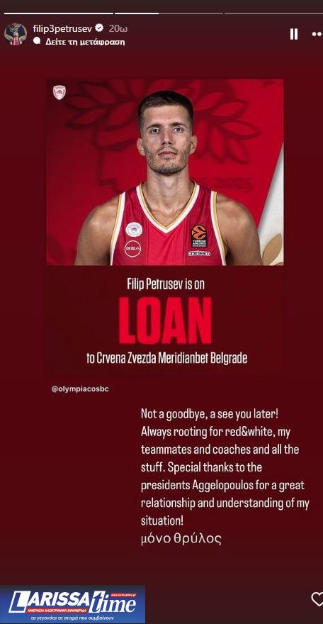 Γι’ αυτό και στον προσωπικό λογαριασμό του στο Instagram, ο Φιλίπ Πετρούσεφ έσπευσε να ευχαριστήσει τους προέδρους του Ολυμπιακού αδελφούς Αγγελόπουλους που τον παραχώρησαν υπό μορφή δανεισμού στον Ερυθρό Αστέρα έως το τέλος της σεζόν.