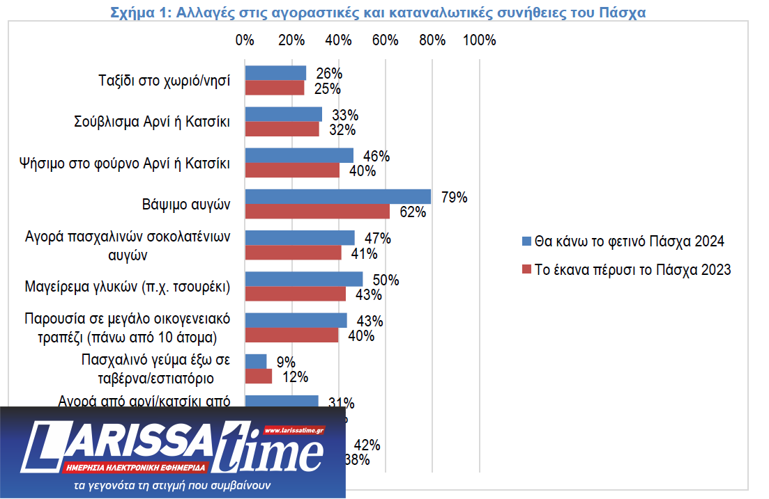Τέλος, ένα μειωμένο ποσοστό 9% (έναντι 12% το 2023) δηλώνει ότι θα κάνει πασχαλινό γεύμα στον κλάδο της εστίασης.