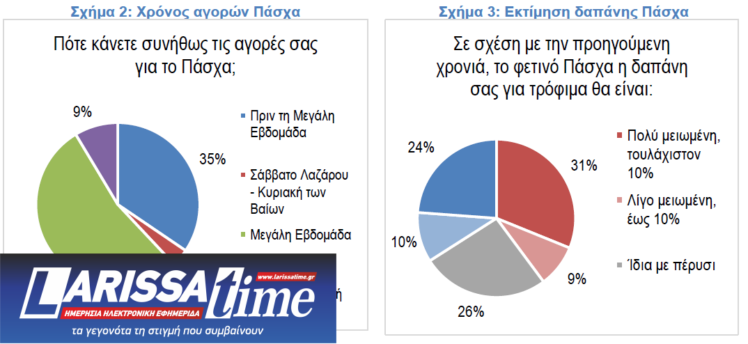 - Η πλειοψηφία των αγορών θα γίνει τη Μεγάλη Εβδομάδα (Σχήμα 2). Συγκεκριμένα μόνο το 35% θα κάνει τις αγορές νωρίτερα. Το 4% θα κάνει τις αγορές του ερχόμενο Σαββατοκύριακο, το 53% την Μεγάλη εβδομάδα και το 9% τελευταία στιγμή.