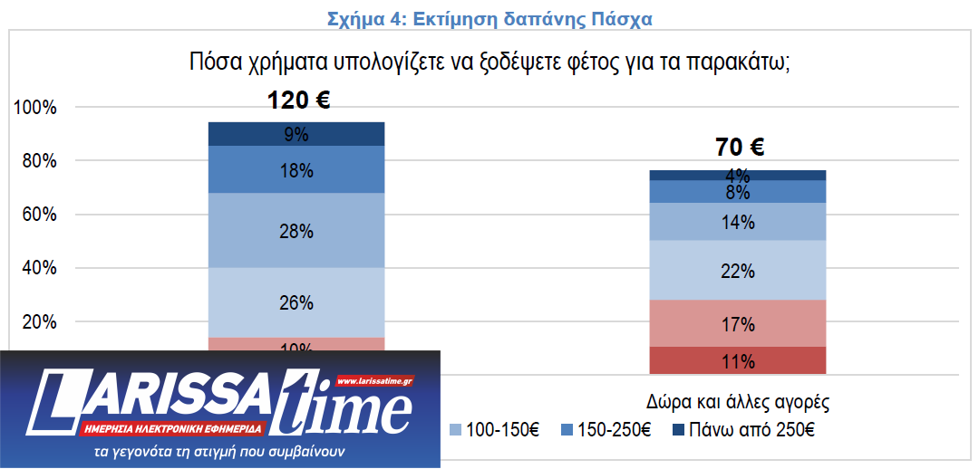 - Τέλος, μεσοσταθμικά εκτιμάται ότι η φετινή δαπάνη για το Πάσχα ανά νοικοκυριό (σχήμα 4) θα ανέρχεται σε 190 ευρώ, 120 ευρώ για είδη παντοπωλείου και 70 ευρώ για άλλα είδη, όπως π.χ. δώρα.