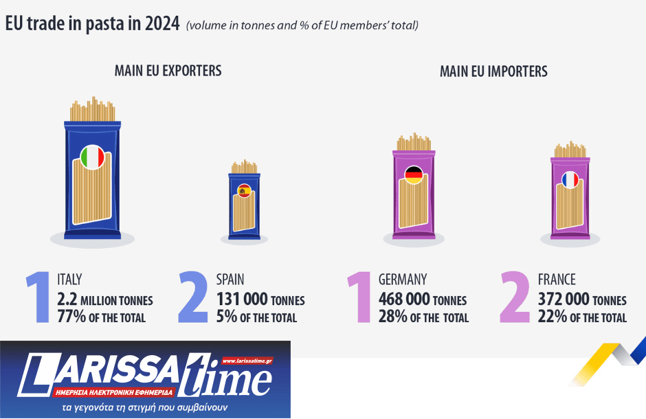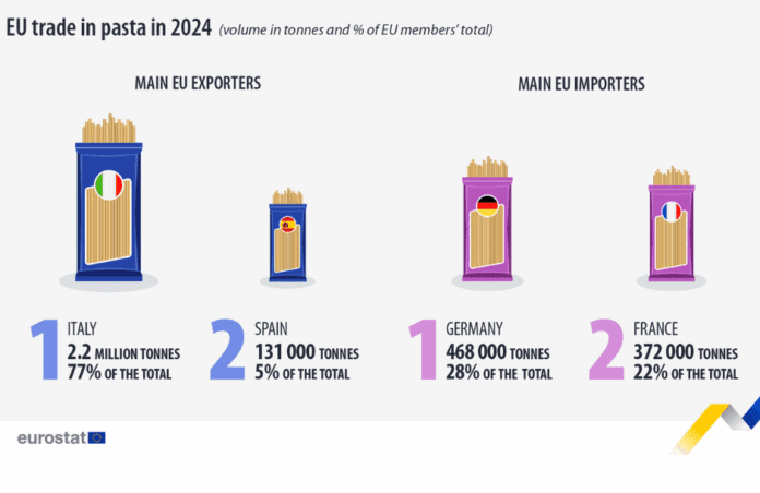 Οι εξαγωγές ζυμαρικών των κρατών μελών της Ευρωπαϊκής Ένωσης ανήλθαν το 2024 σε 2,9 εκατ. τόνους, ενώ οι εισαγωγές άγγιξαν τους 1,7 εκατ. τόνους.