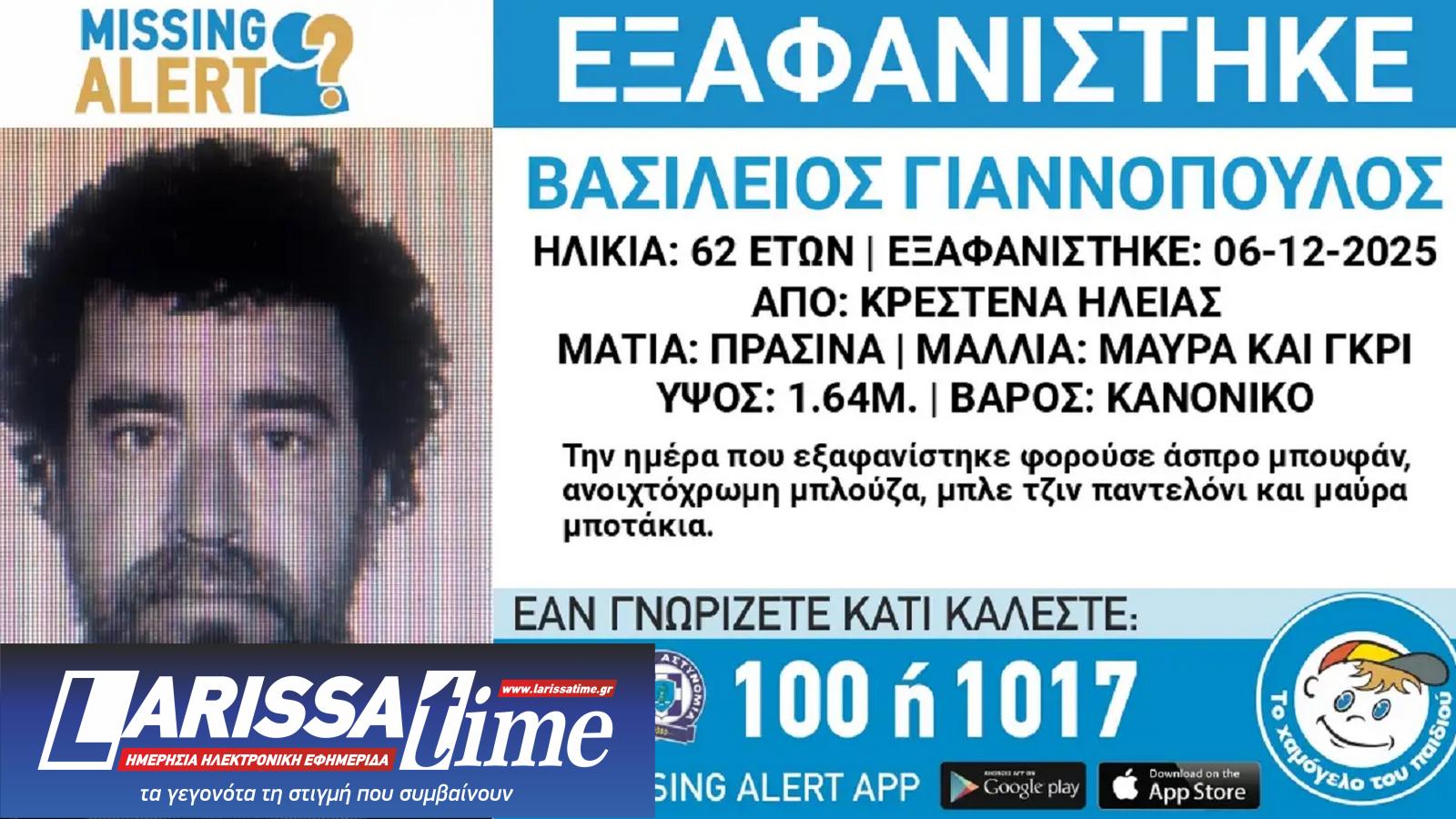 Ένας 62χρονος άνδρας αγνοείται από το Σάββατο 6 Δεκεμβρίου στα Κρέστενα Ηλείας, με το «Χαμόγελο του Παιδιού» να εκδίδει ανακοίνωση για την εξαφάνισή του. Ο οργανισμός ενημερώθηκε στις 9 Δεκεμβρίου και, ύστερα από αίτημα των συγγενών του, προχώρησε στη δημοσιοποίηση των στοιχείων του, καθώς υπάρχουν φόβοι ότι η ζωή του μπορεί να βρίσκεται σε κίνδυνο.