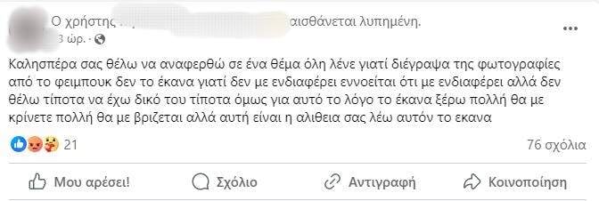 «Καλησπέρα σας θέλω να αναφερθώ σε ένα θέμα όλοι λένε γιατί διέγραψα της φωτογραφίες από το facebook. Δεν το έκανα γιατί δεν με ενδιαφέρει, εννοείται ότι με ενδιαφέρει, αλλά δεν θέλω τίποτα να έχω δικό του τίποτα. Όμως για αυτό το λόγο το έκανα ξέρω πολλοί θα με κρίνετε πολλή θα με βρίζετε. Αλλά αυτή είναι η αλήθεια» αναφέρεται στην σχετική ανάρτησή της.