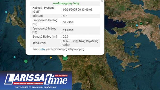 Σεισμός 4,7 Ρίχτερ σημειώθηκε 6 Χλμ. Β της Νέας Φιγαλείας Ηλείας, στις 02:13:09 τα ξημερώματα της Κυριακής. Όπως αναφέρει το Γεωδυναμικό Ινστιτούτο ο σεισμός είχε εστιακό βάθος 20 χιλιομέτρων.