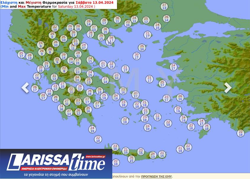 Θερμοκρασία: Από 11 έως 28 και κατά τόπους στα ηπειρωτικά 29 βαθμούς Κελσίου. Στην Ήπειρο 2 με 3 βαθμούς χαμηλότερα.