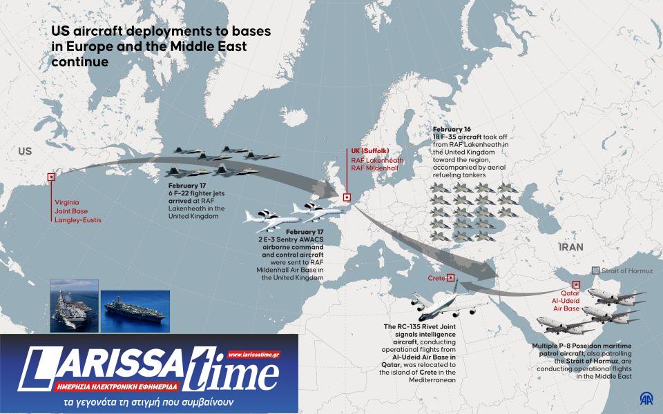 Τις προηγούμενες ημέρες τουλάχιστον 18 μαχητικά αεροσκάφη F-35A Lightning II της Πολεμικής Αεροπορίας των ΗΠΑ απογειώθηκαν από τη βάση Lakenheath της RAF στο Ηνωμένο Βασίλειο.