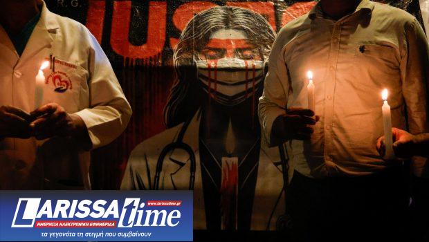 Γιατροί κρατούν αφίσες και φωνάζουν συνθήματα κατά τη διάρκεια πορείας διαμαρτυρίας καταδικάζοντας τον βιασμό και την δολοφονία συναδέλφου τους