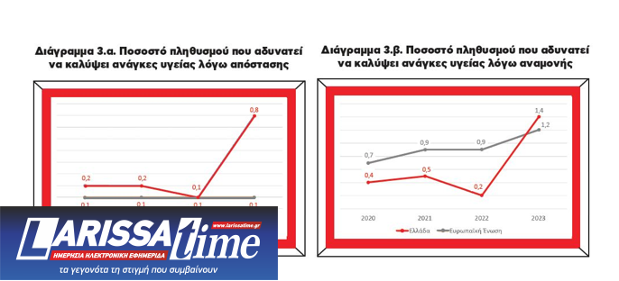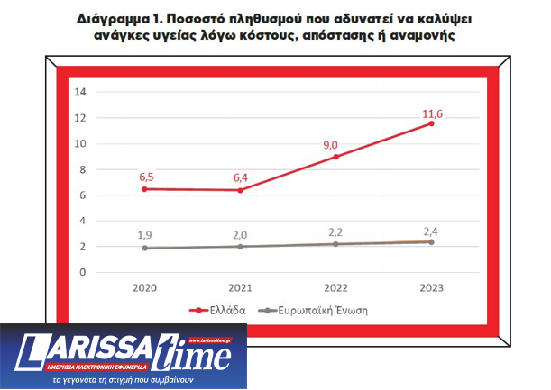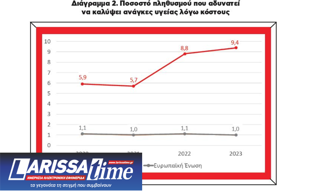 Το 2020-21 το ποσοστό των Ελλήνων που αδυνατούσε να καλύψει το πρόβλημα υγείας του ήταν κοντά στο 6,5% έναντι περίπου 2% στον μέσο όρο της Ευρωπαϊκής Ένωσης, δηλαδή παραπάνω από τριπλάσιο.