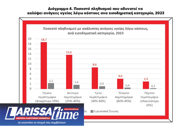 Το ποσοστό του πληθυσμού στο πλουσιότερο 20% της Ελλάδας που αδυνατεί να καλύψει τις ανάγκες υγείας λόγω κόστους (2,9%) είναι υψηλότερο από το αντίστοιχο ποσοστό στο φτωχότερο 20% του πληθυσμού της Ευρωπαϊκής Ένωσης (2,2%).