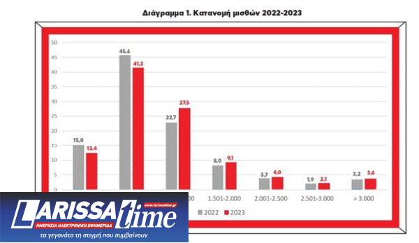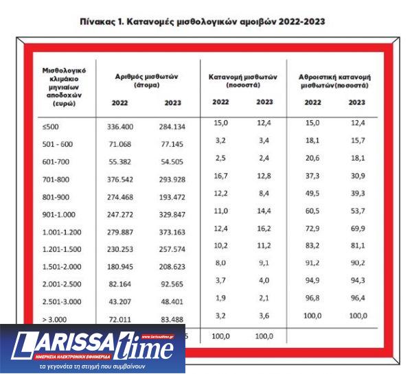 Από τα παραπάνω στοιχεία μπορούμε να υπολογίσουμε έναν απλουστευμένο δείκτη της μισθολογικής ανισότητας, τον λόγο του διάμεσου μισθού προς τον μέσο, δηλαδή πόσο κάτω από τον μέσο όρο βρίσκονται οι μισοί μισθωτοί. Στην περίπτωσή μας, αν υποθέσουμε ότι ο διάμεσος μισθός του 2022 ήταν 900 ευρώ, τότε ο λόγος του προς τον μέσο (1.176,5 ευρώ, βλ. Πίνακα 2) ήταν 76,5% ή, με άλλα λόγια, οι αμοιβές των μισών μισθωτών δεν ξεπερνούσαν τα τρία τέταρτα του μέσου μισθού. Παρότι, όπως είπαμε, δεν μπορούμε να υπολογίσουμε με ακρίβεια τον διάμεσο μισθό του 2023, ώστε να δούμε αν η αναλογία με τον μέσο αυξήθηκε ή μειώθηκε, το βέβαιο είναι πως η πλειοψηφία των μισθωτών εξακολουθεί να αμείβεται αρκετά κάτω από τον μέσο μισθό.