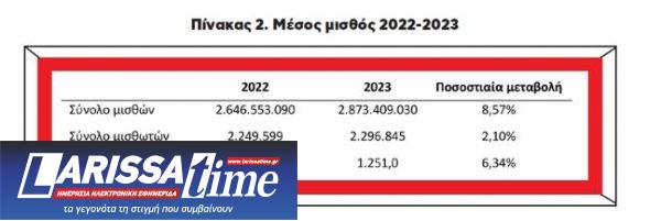 Ο μέσος μισθός προκύπτει από τον πίνακα ΙΒ4 της έκθεσης της ΕΡΓΑΝΗΣ όπου παρουσιάζεται το σύνολο των μισθολογικών αμοιβών (και όχι, όπως εσφαλμένα αναφέρεται στον τίτλο, ο μέσος μισθός). Αν διαιρέσουμε με το σύνολο των μισθωτών παίρνουμε τον μέσο μισθό για τα έτη 2022 και 2023 όπως φαίνεται στον Πίνακα 2.