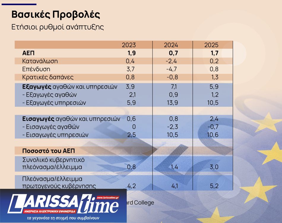 Συγκεκριμένα, το Ινστιτούτο εκτιμά ότι το ΑΕΠ θα αυξηθεί κατά 1,9% το 2023, 0,7% το 2024 και 1,7% το 2025, αποδίδοντας την απαισιόδοξη αυτή εικόνα «στην επιβράδυνση των ιδιωτικών καταναλωτικών δαπανών, στη σημαντική απώλεια παραγωγής λόγω των κλιματικών ζημιών από πλημμύρες και πυρκαγιές και την αδυναμία της κυβέρνησης να διαθέσει οικονομικούς πόρους για την ταχεία αντιμετώπισή τους, καθώς και στις καθυστερήσεις στην πρόοδο και ολοκλήρωση των έργων υποδομής που χρηματοδοτούνται από ευρωπαϊκά κονδύλια του Ταμείου Ανάκαμψης».