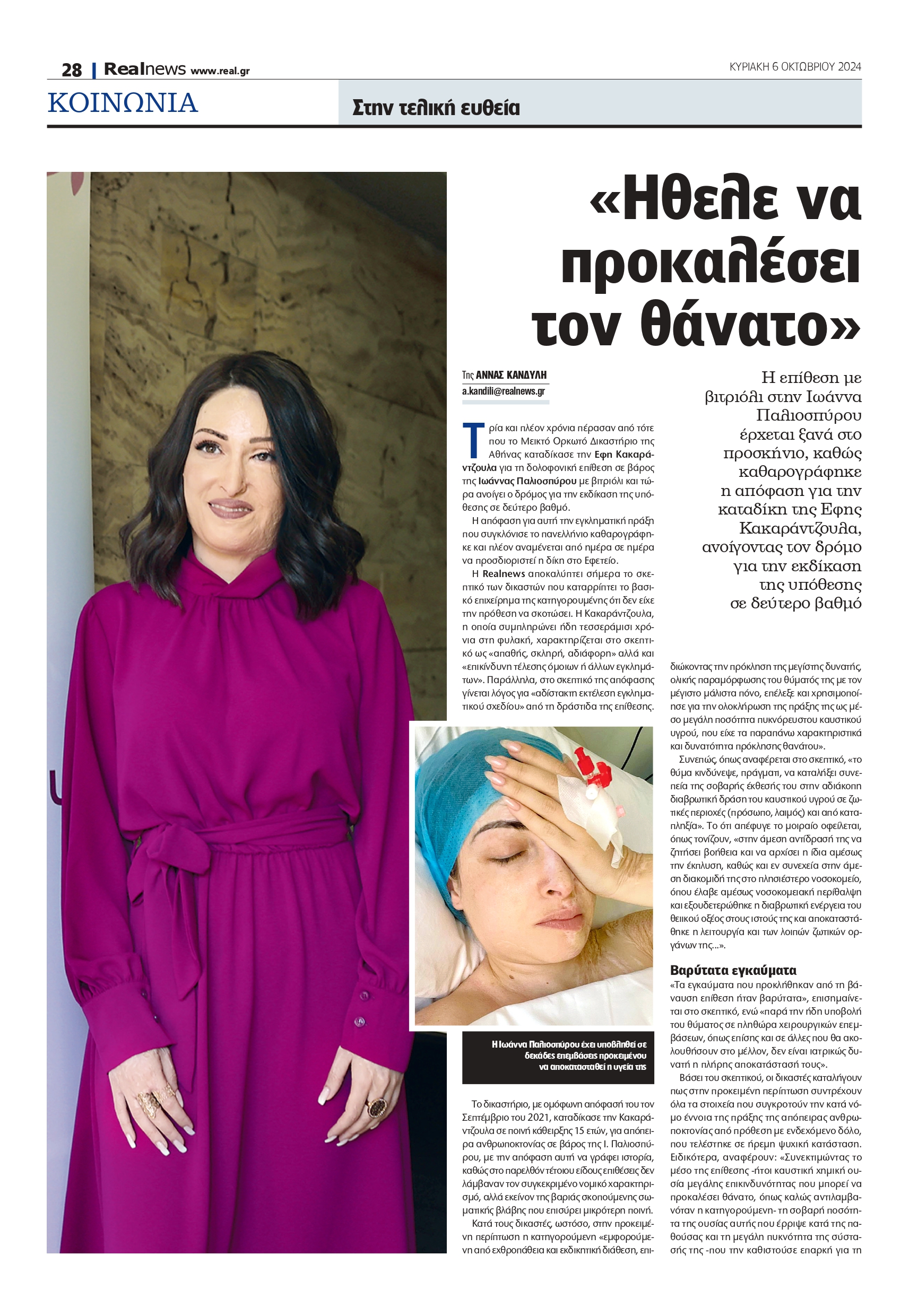 Tρία και πλέον χρόνια πέρασαν από τότε που το Μεικτό Ορκωτό Δικαστήριο της Αθήνας καταδίκασε την Εφη Κακαράντζουλα για τη δολοφονική επίθεση σε βάρος της Ιωάννας Παλιοσπύρου με βιτριόλι και τώρα ανοίγει ο δρόμος για την εκδίκαση της υπόθεσης σε δεύτερο βαθμό. Η απόφαση για αυτή την εγκληματική πράξη που συγκλόνισε το πανελλήνιο καθαρογράφηκε και πλέον αναμένεται από ημέρα σε ημέρα να προσδιοριστεί η δίκη στο Εφετείο.