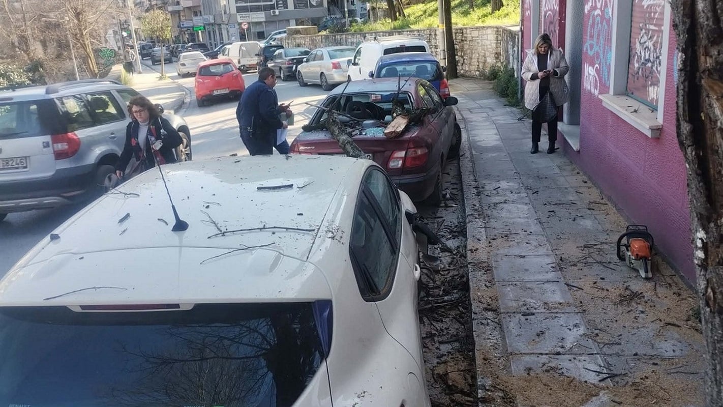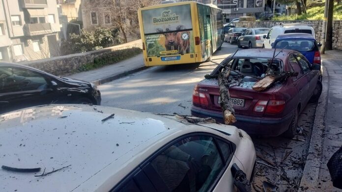Υλικές ζημιές σε δύο σταθμευμένα αυτοκίνητα επί της οδού Μπιζανίου στα Ιωάννινα, λίγα μέτρα από το Δημοτικό Ωδείο, προκάλεσε η πτώση μεγάλων κλαδιών δέντρων, το μεσημέρι της Τετάρτης (11/3).